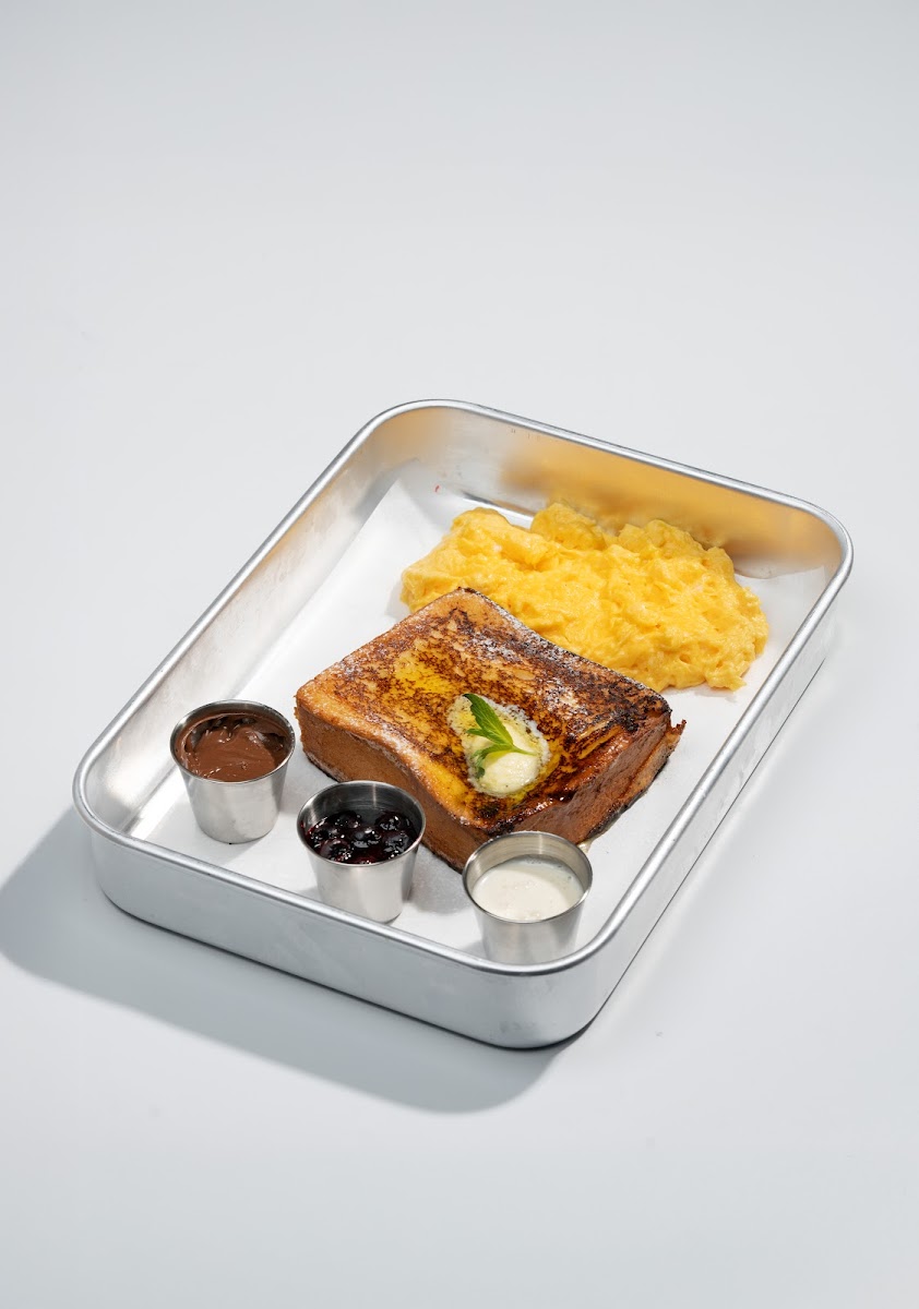 Brioche toast, sweet dips, and scrambled eggs on the side